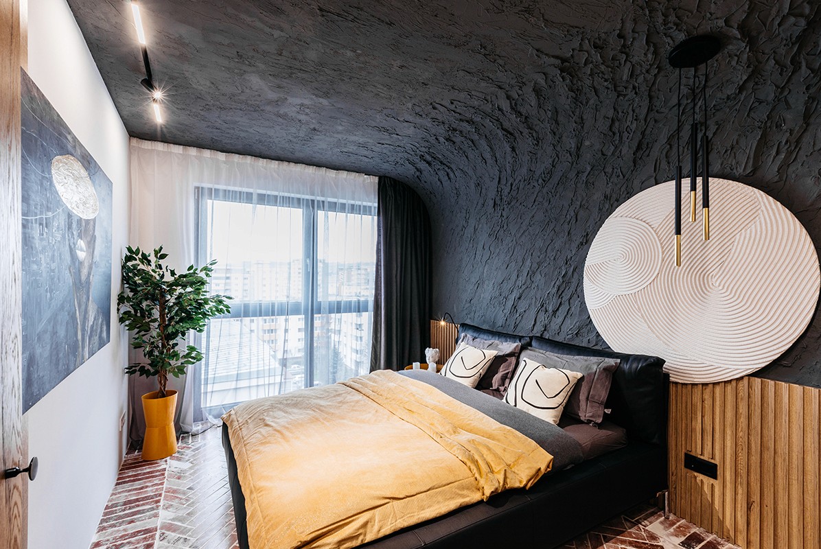 Pentru dormitor, am transformat peretele principal într-o sculptură texturală - o suprafață organică care pare să curgă de la tavan spre podea, creând o experiență tactilă și vizuală unică o atmosferă de pestera urbana sofisticata.