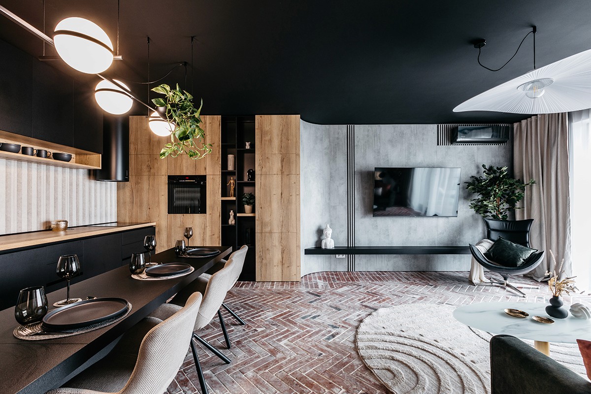 Decizia de a vopsi tavanele în negru profund a fost primul gest îndrăzneț. Apoi m-am gandit cum pardoseala din cărămidă va aduce patina timpului și va echilibra modernitatea mobilierului.