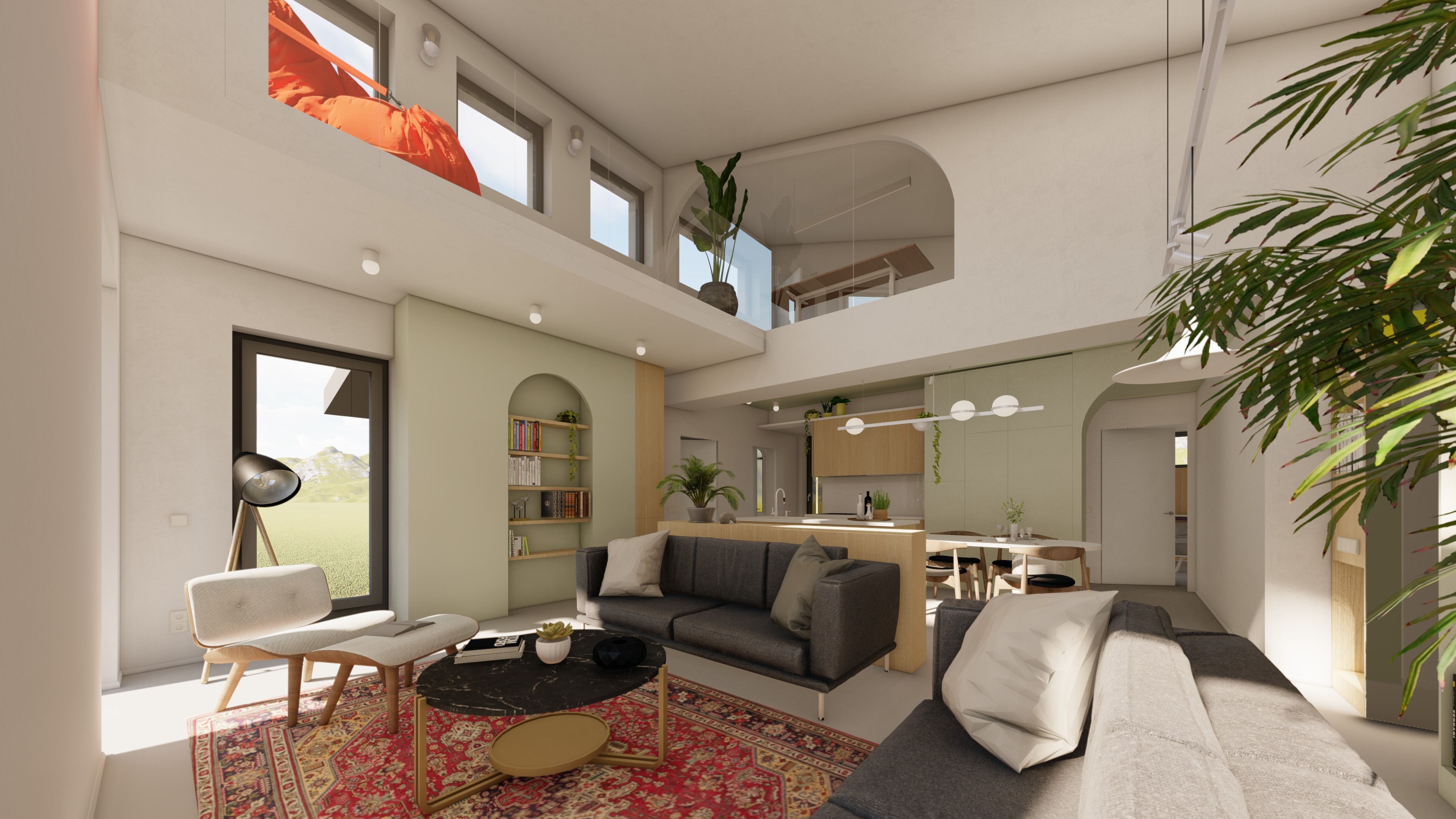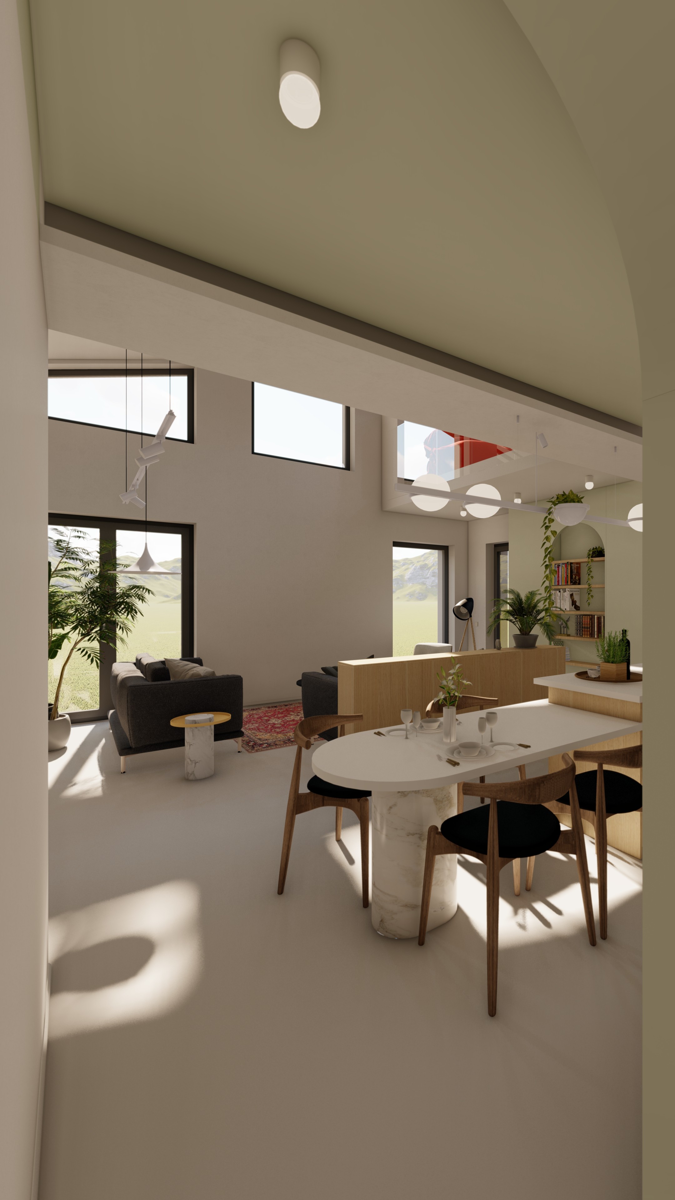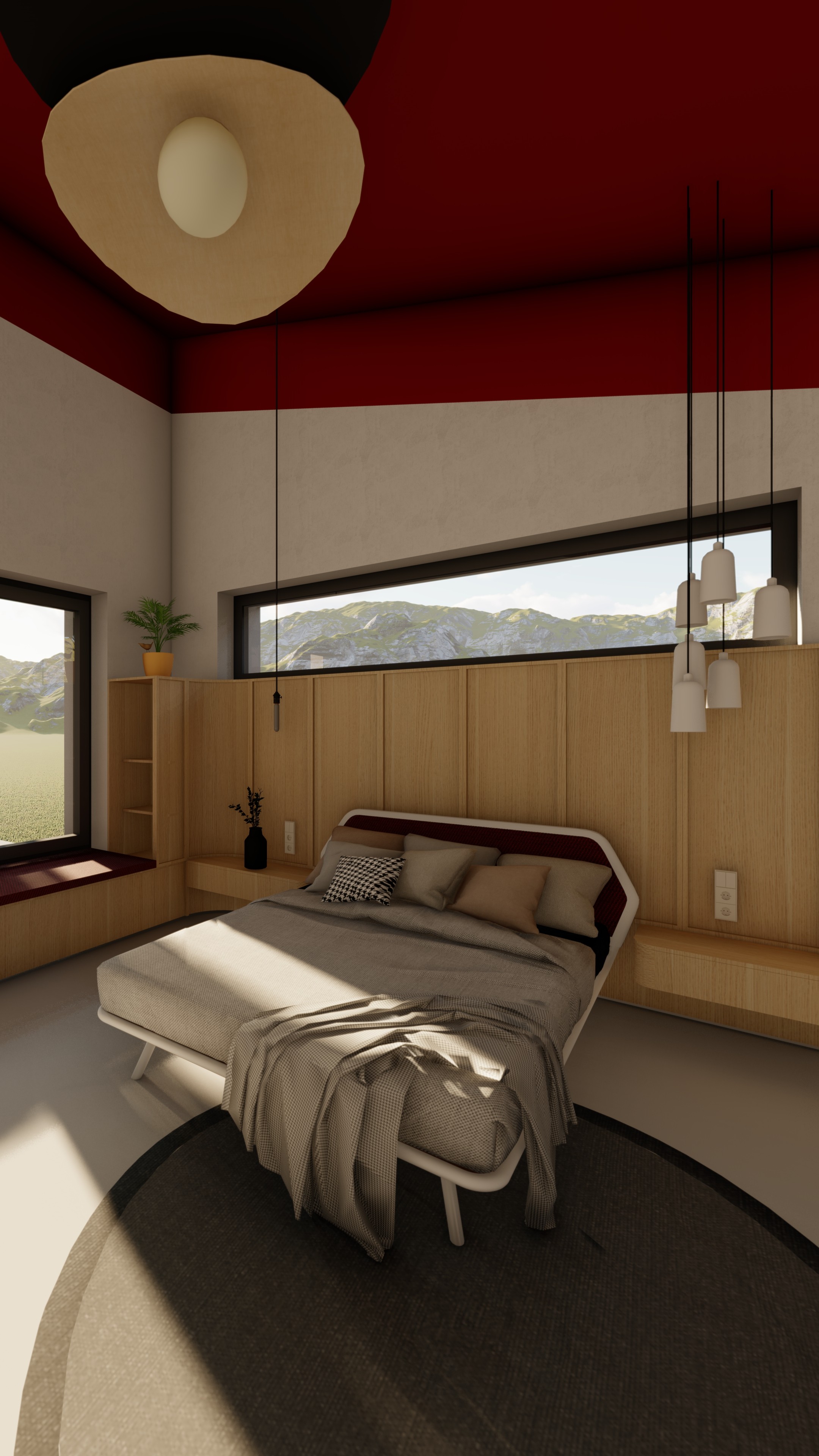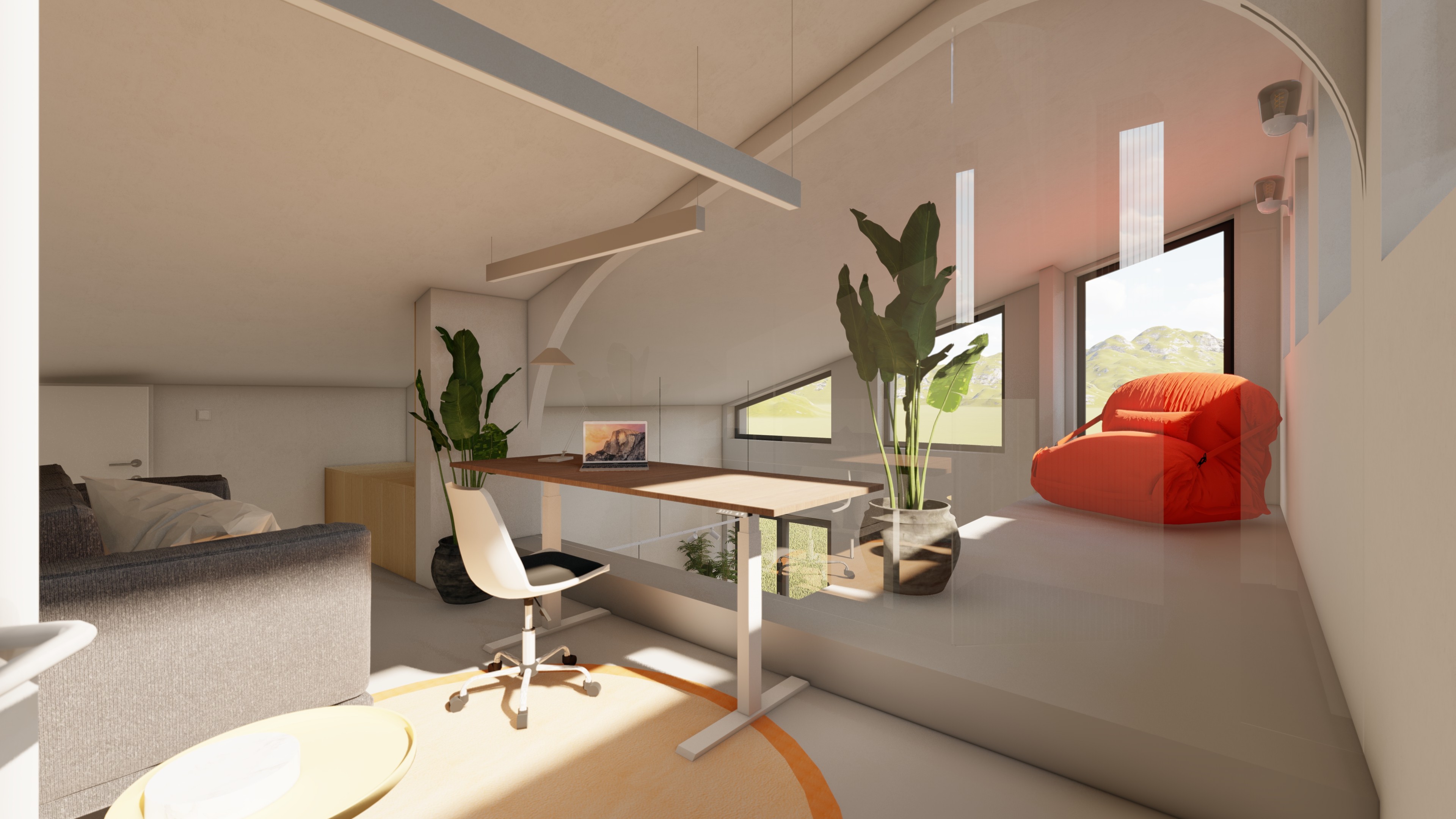 Designul a găsit pacea în stratificare și tranziții subtile între universuri stilistice distincte. Zonele comune s-au îmbrăcat în eleganța sobră a paletei nordice - griul perlat, albul cald și lemnul natural creând o scenă neutră pe care să danseze accente controlate de culoare. Verdele fistic din living și roșul profund din dormitor au devenit semnături discrete ale personalității artistice, fără să perturbe armonia generală. Mezaninul s-a transformat în sanctuarul liniștit al celui organizat, mobilierul din lemn deschis la culoare și suprafețele curate oferind concentrarea dorită, în timp ce ferestrele panoramice îl conectează permanent cu peisajul dinamic al dealurilor. Zona creativă și-a găsit expresia în explozia de galben solar - de la plafon la podea, spațiul vibrează cu energia necesară inspirației, iar perdea discretă îi permite să se transforme instant dintr-un atelier artistic într-o cameră de oaspeți elegantă.