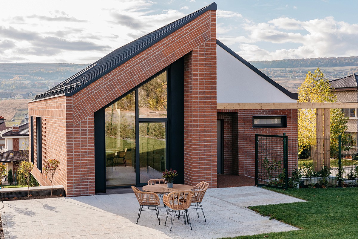 Pentru că avem străzi pe 2 laturi ale terenului, am putut să fac intrarea principală pe sus și să amplasez astfel livingul și bucătăria la nivelul superior. Astfel familia va profita de intimitate, dar și de priveliștea generoasă de sud-est. Bucătăria are ieșire direct pe terasă, iar din curte prin intermediul vitrajelor mari, privirea se plimbă fluid prin spațiul de gătit, de servit masa, apoi prin spațiul familiei până se fixeză pe priveliștea Clujului din depărtare. Dormitoarele sunt la nivelul inferior, iar spațiile au fost gândite strict funcțional pentru că familia vrea să petreacă tot tipul împreună în zona de zi.